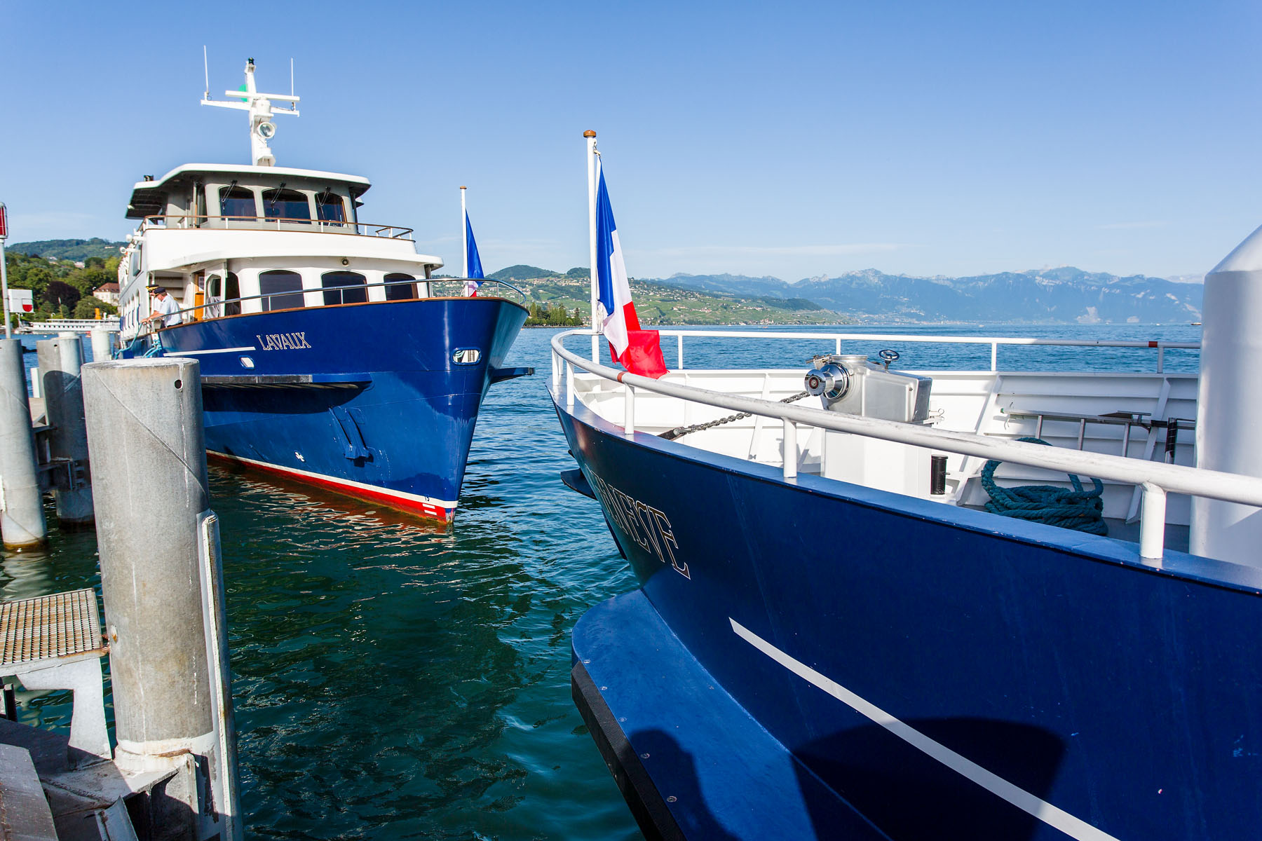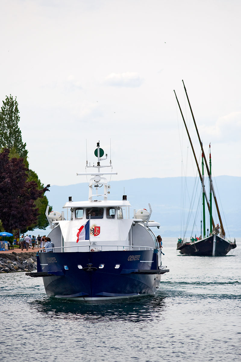Arrivée à Évian-les-Bains, à droite, la barque SAVOIE (14 juin 2009)>