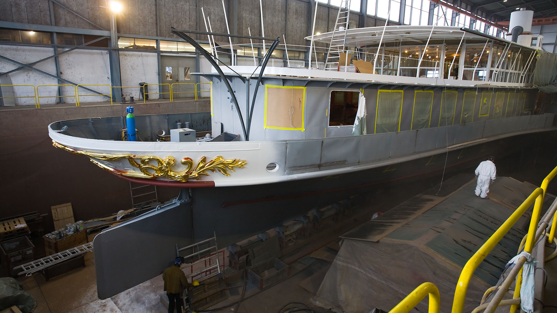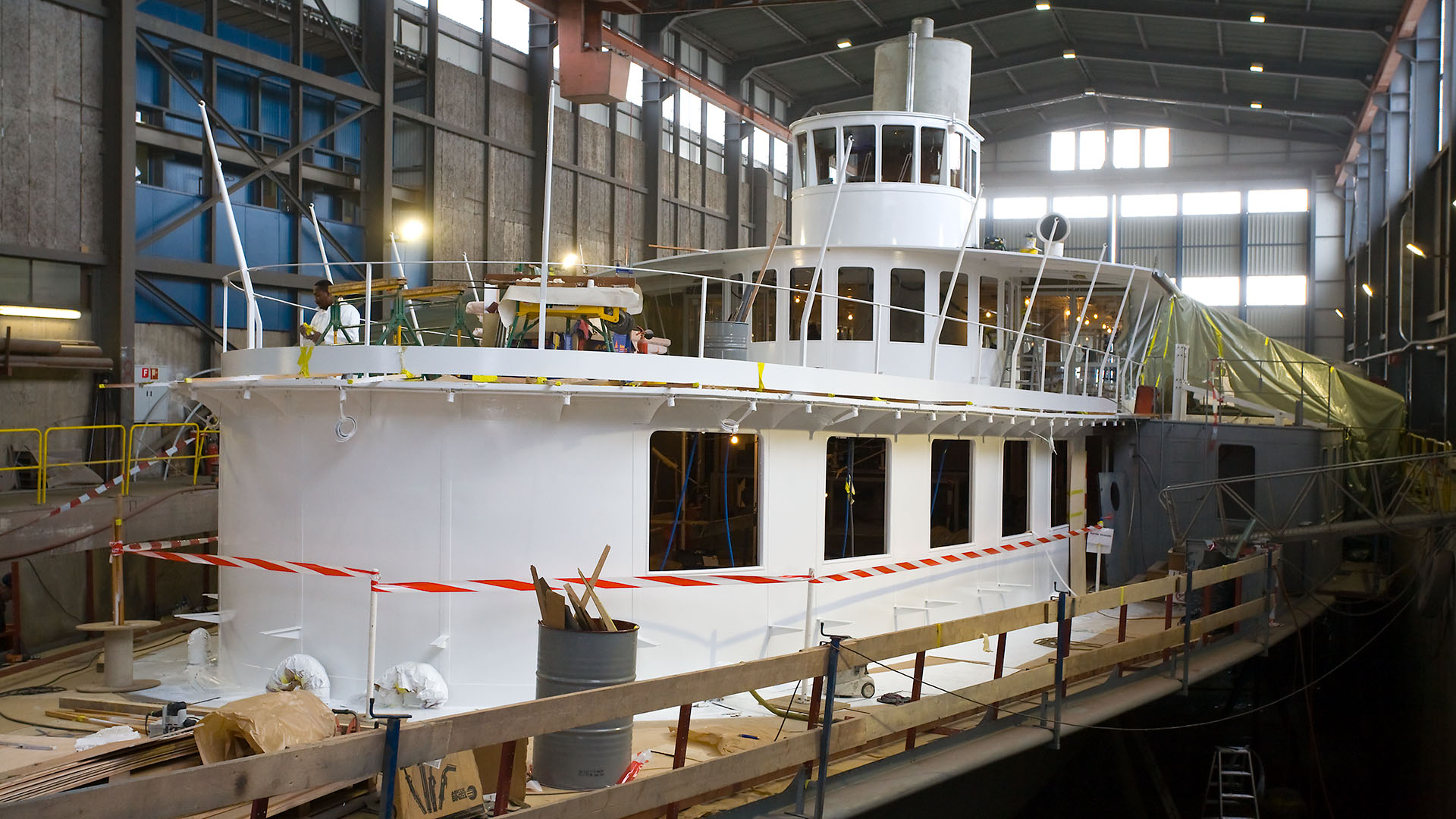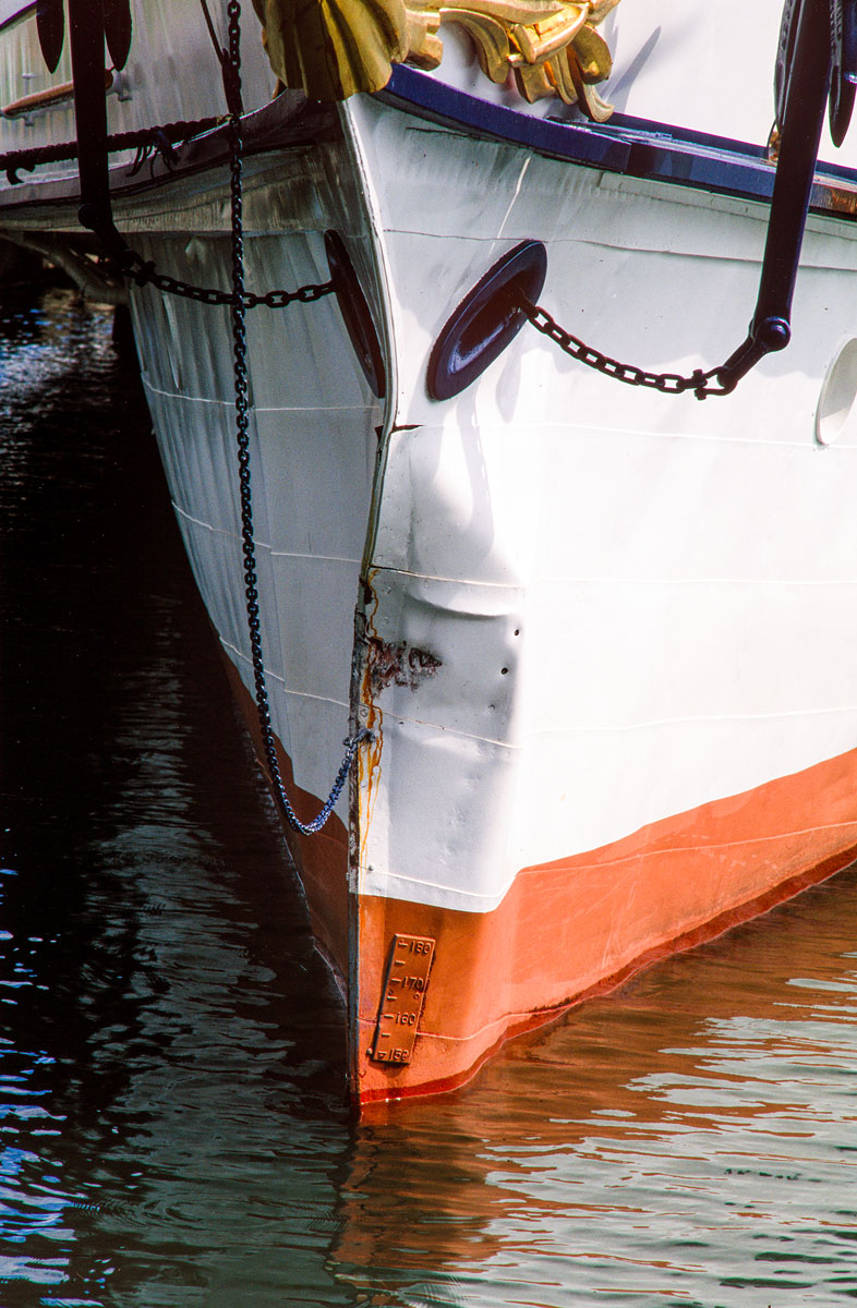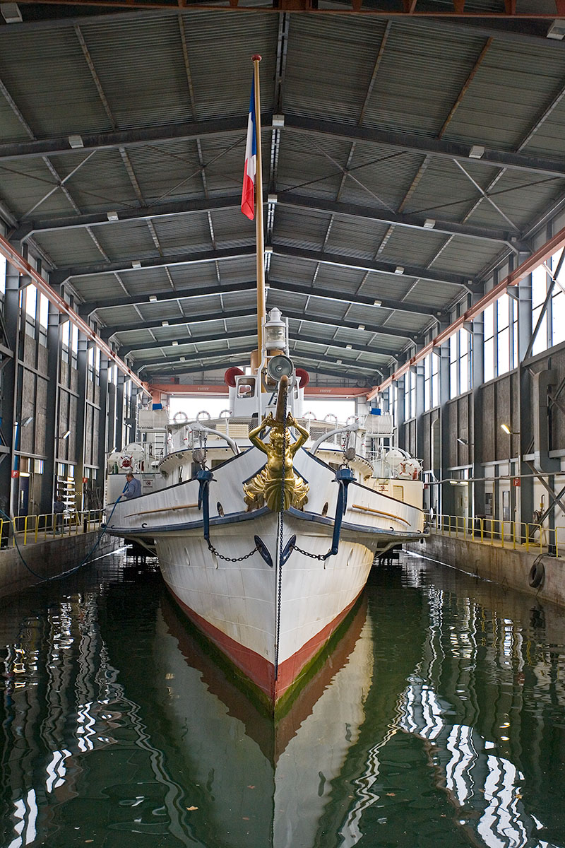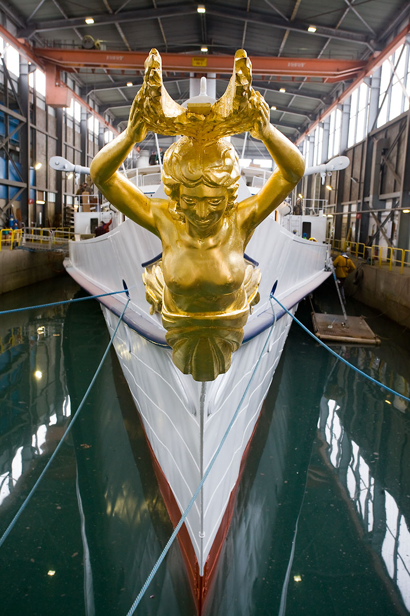 Mise en place des décorations de proue & de poupe, réparation après collision, au chantier CGN (2003)