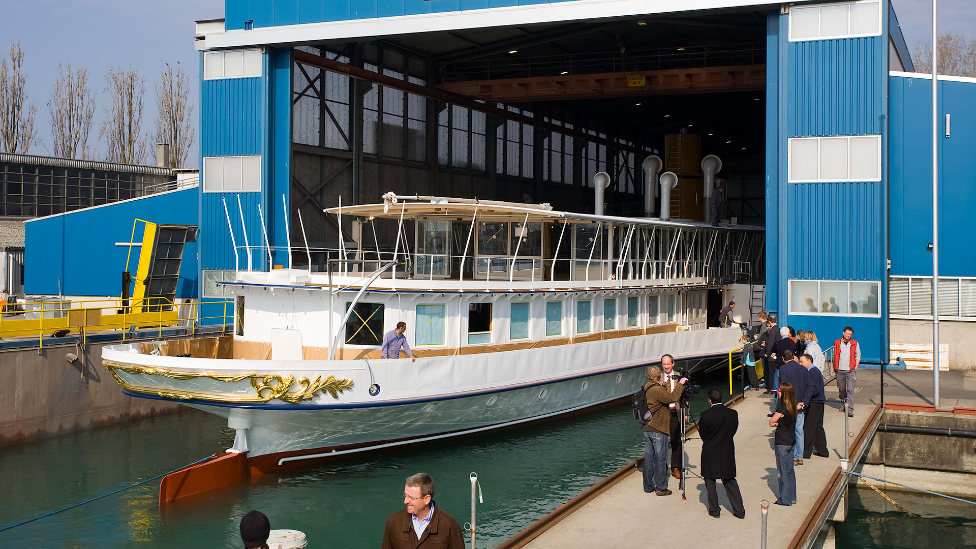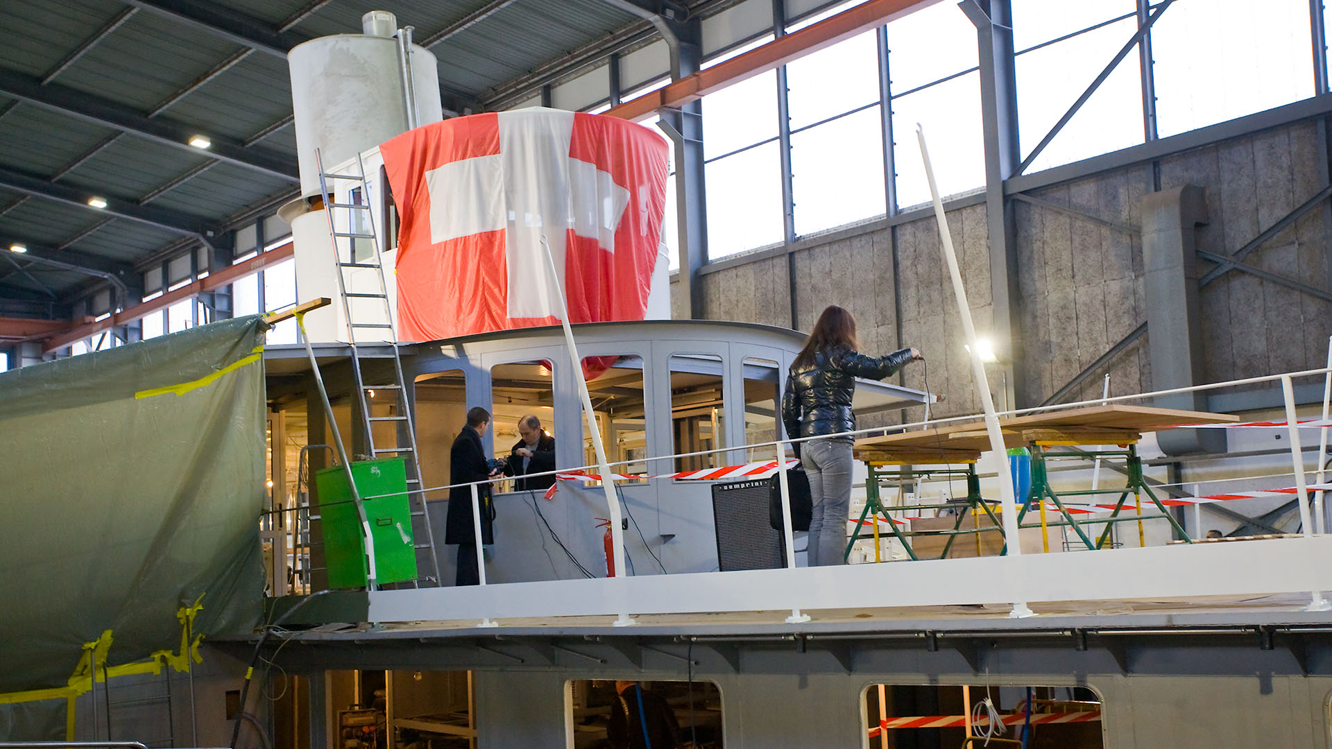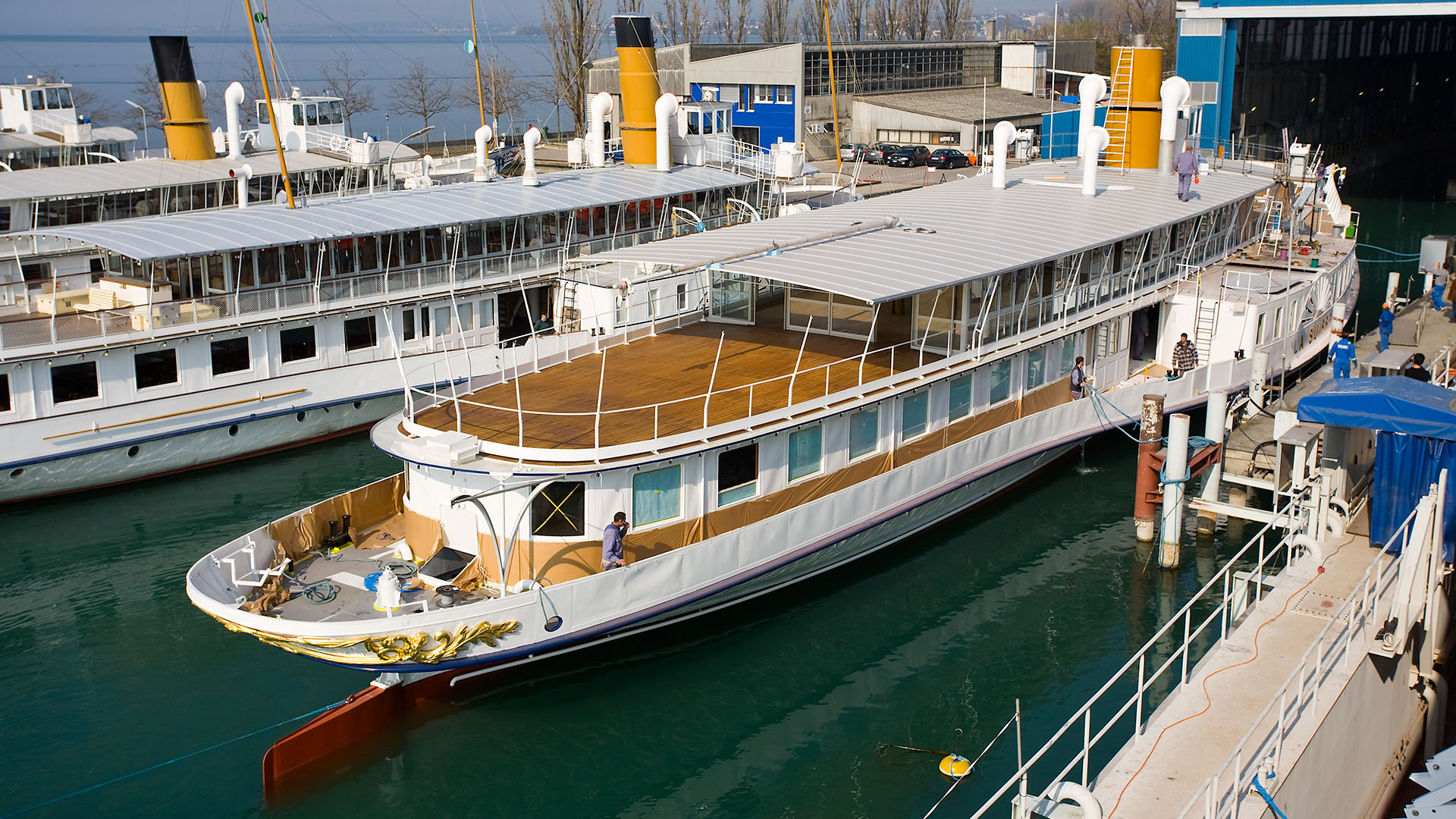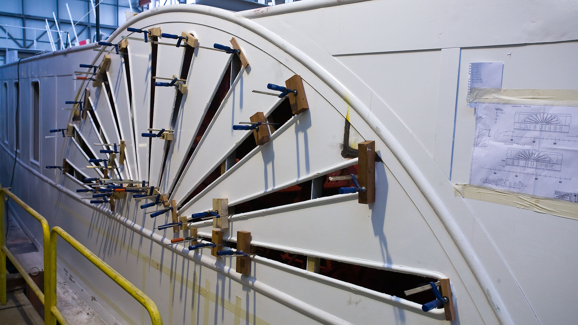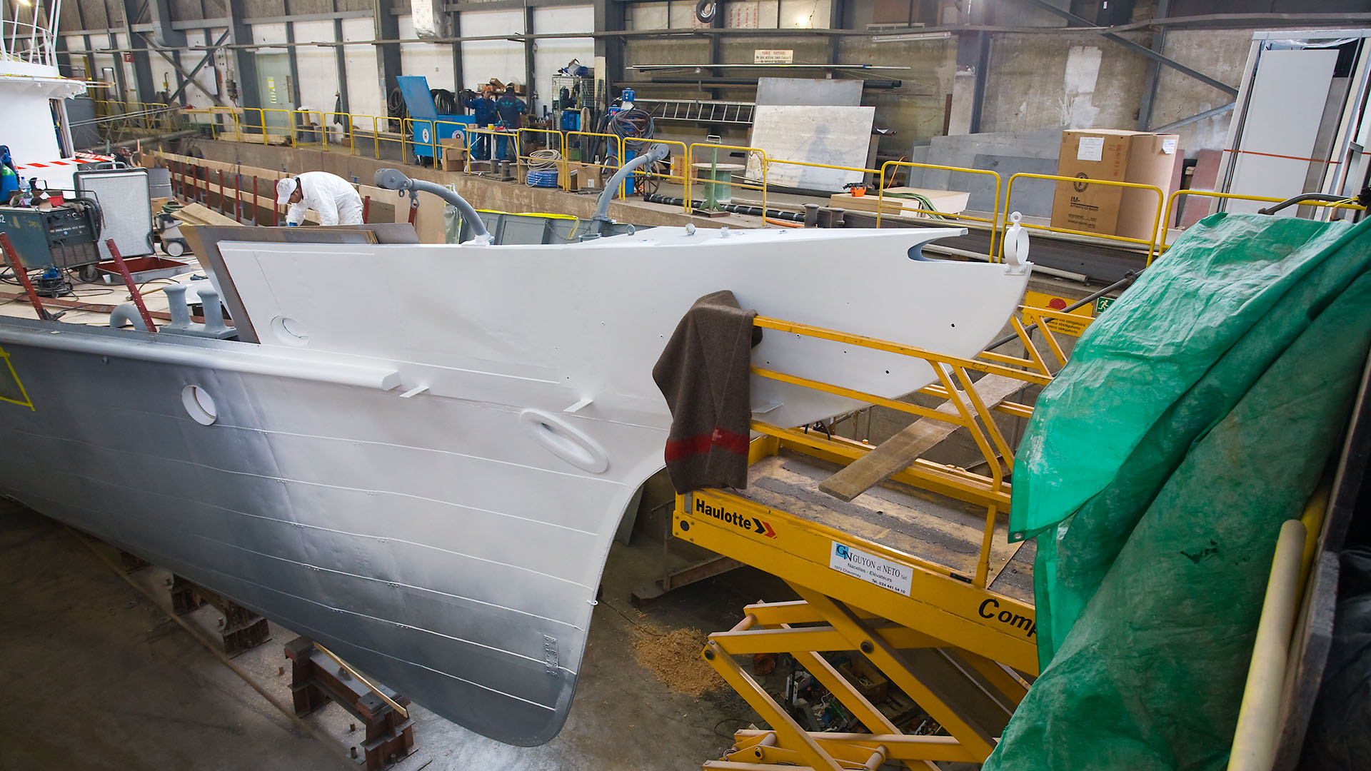 Mise en place des décorations de proue & de poupe, réparation après collision, au chantier CGN (2003)