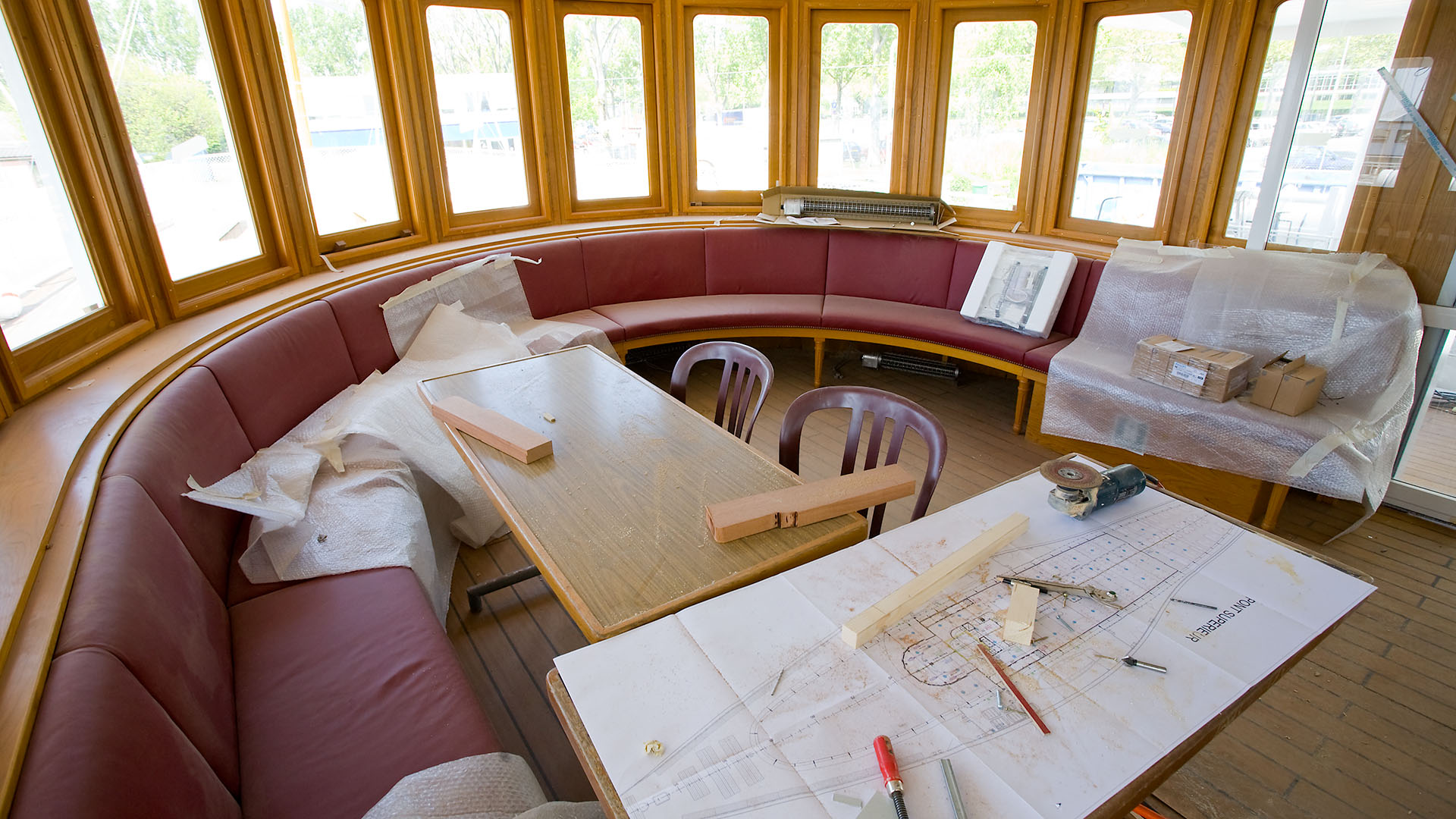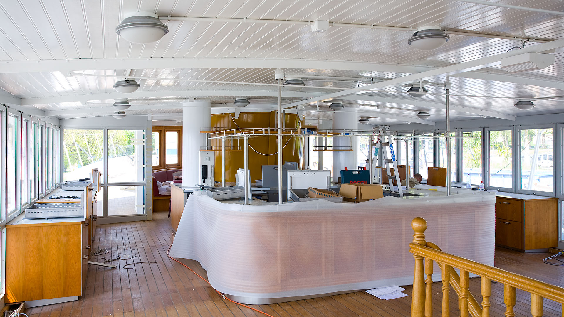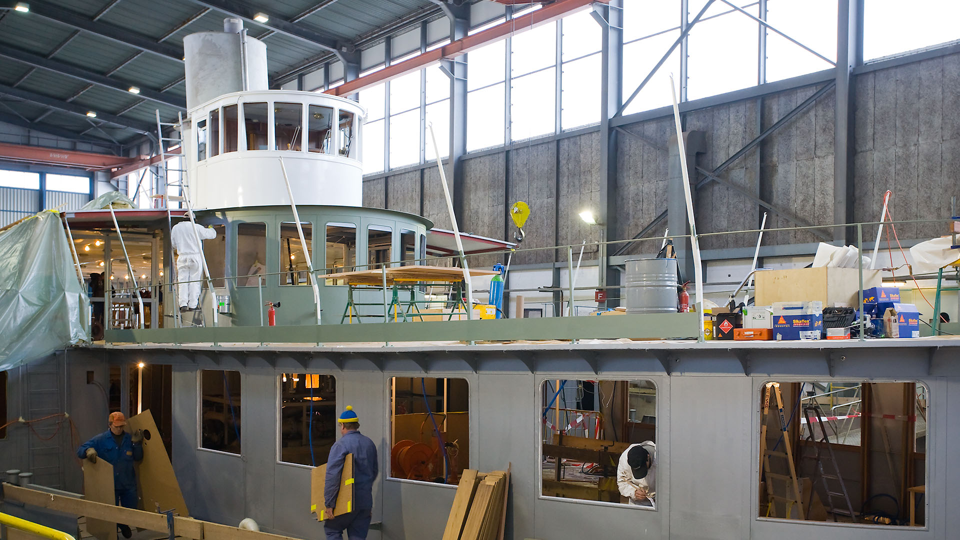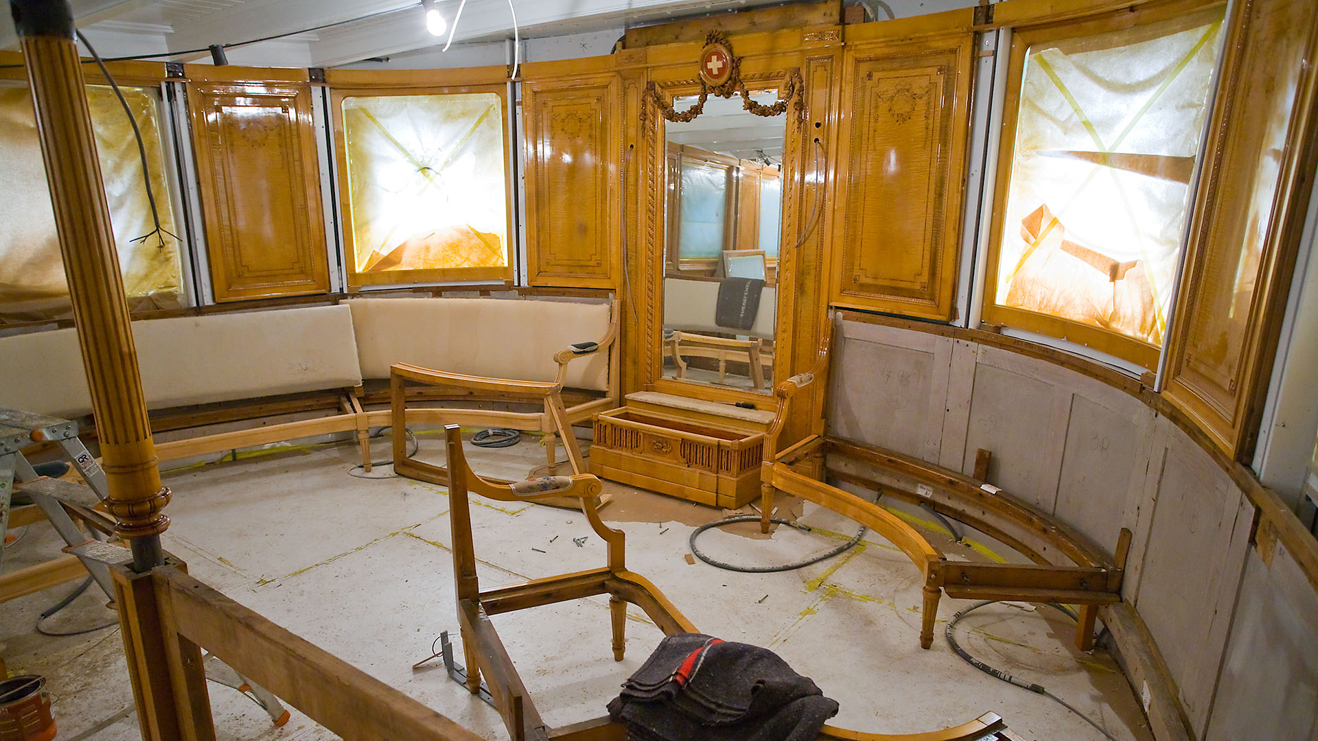 Mise en place des décorations de proue & de poupe, réparation après collision, au chantier CGN (2003)