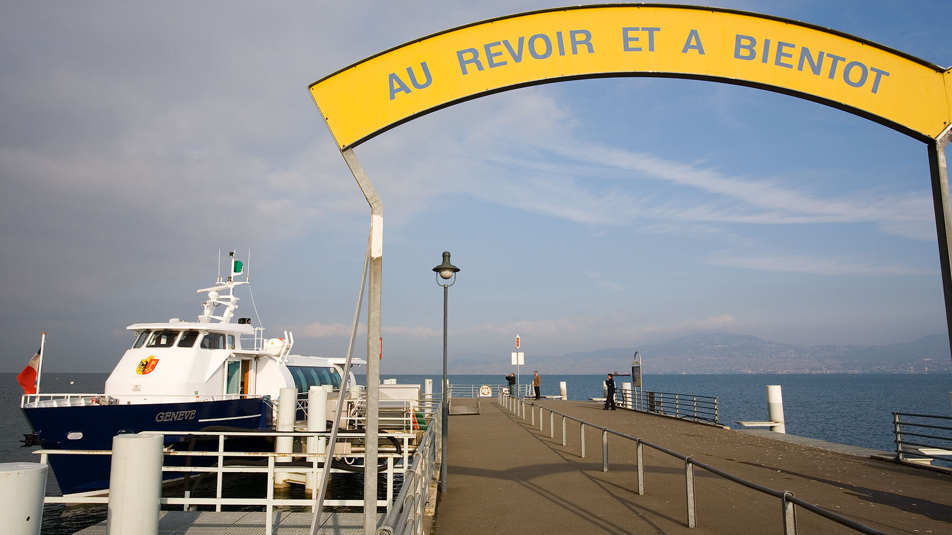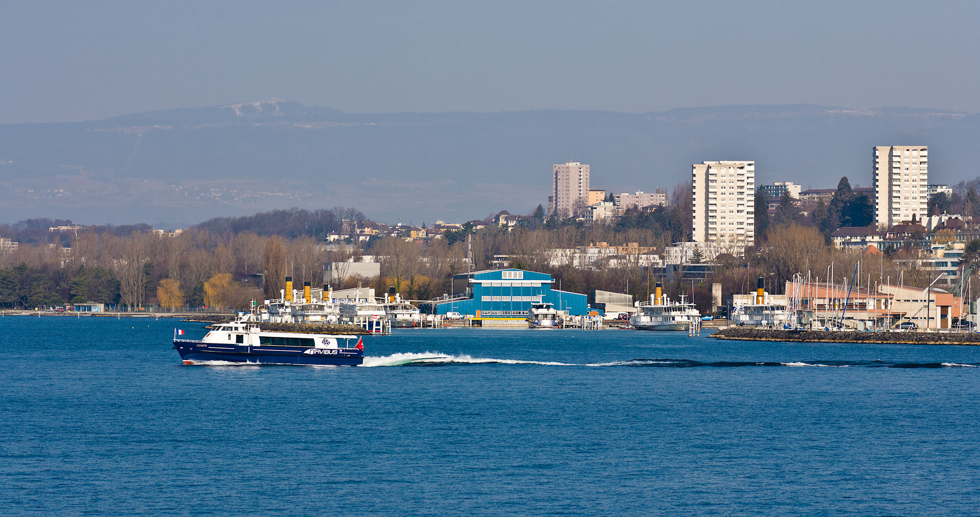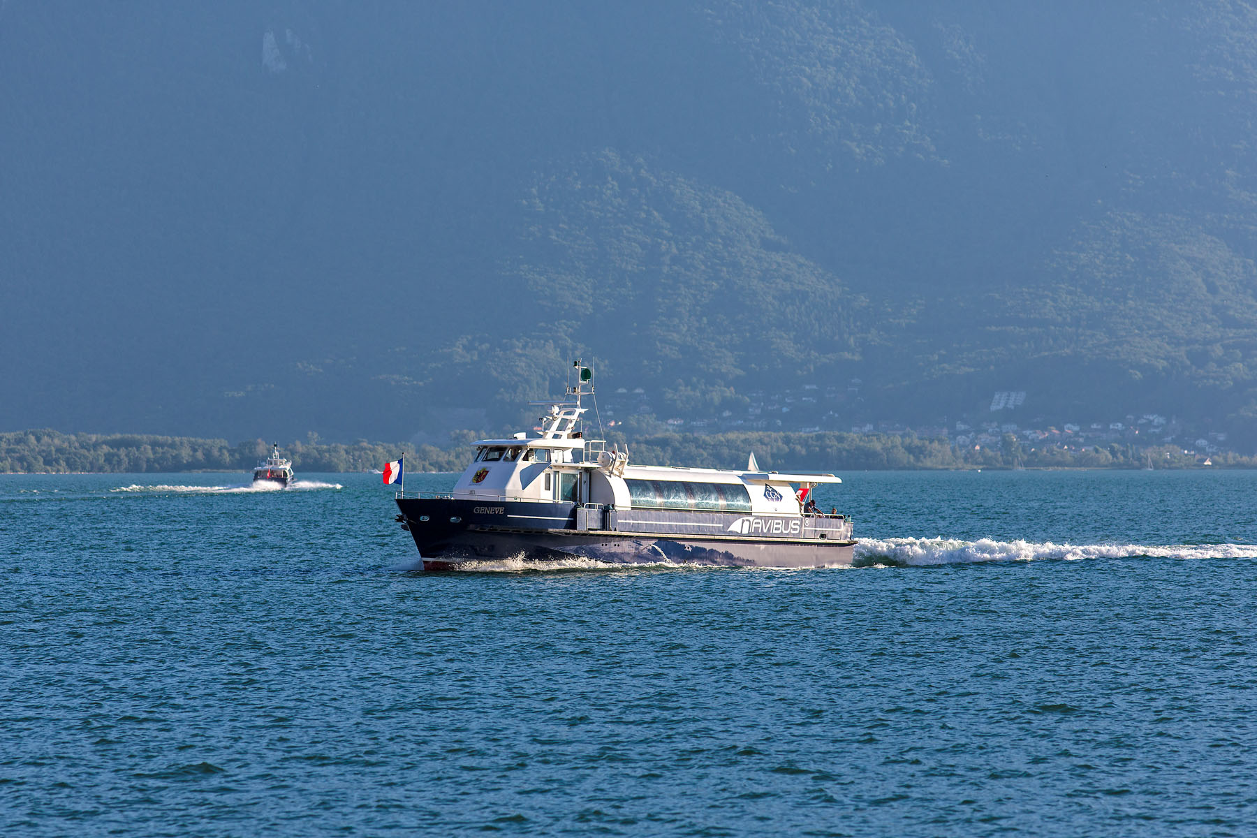 Arrivée à Évian-les-Bains, à droite, la barque SAVOIE (14 juin 2009)>