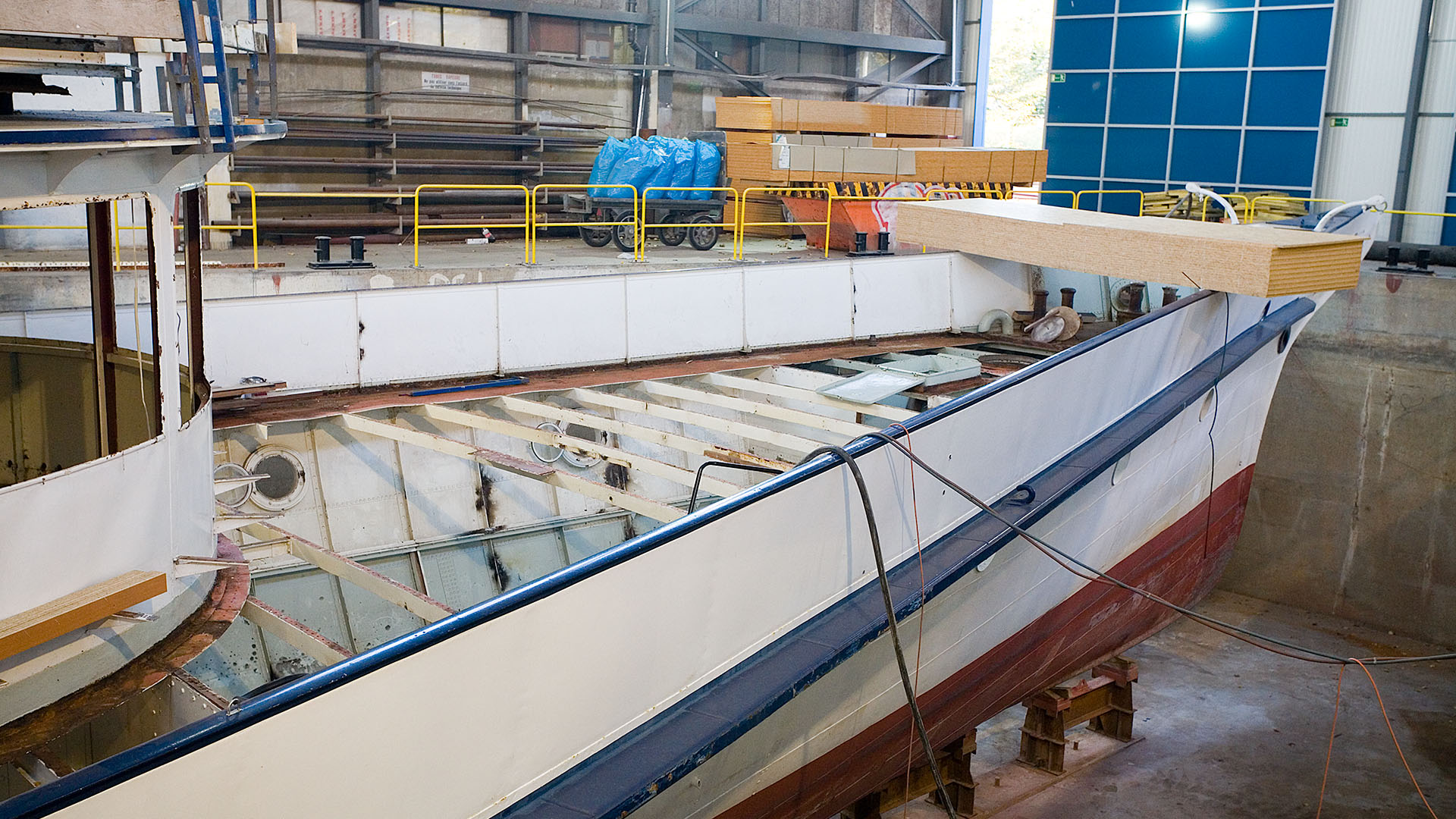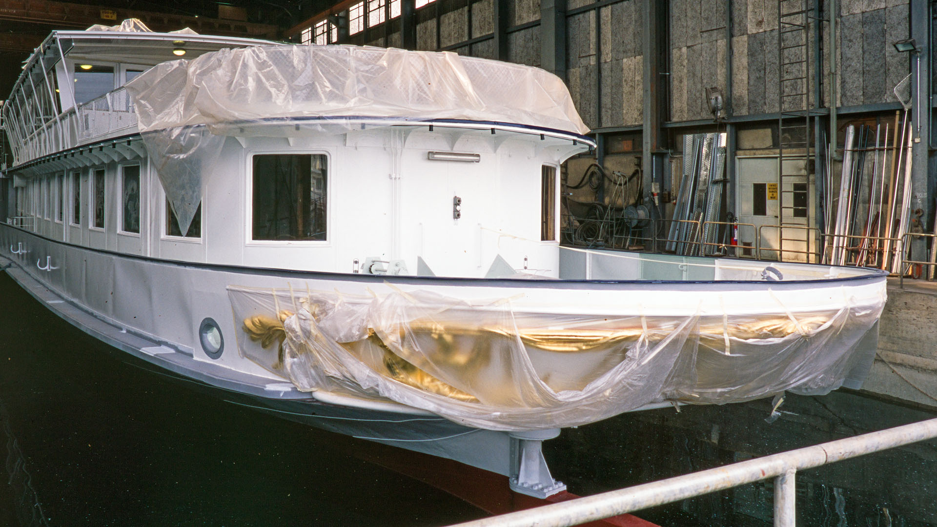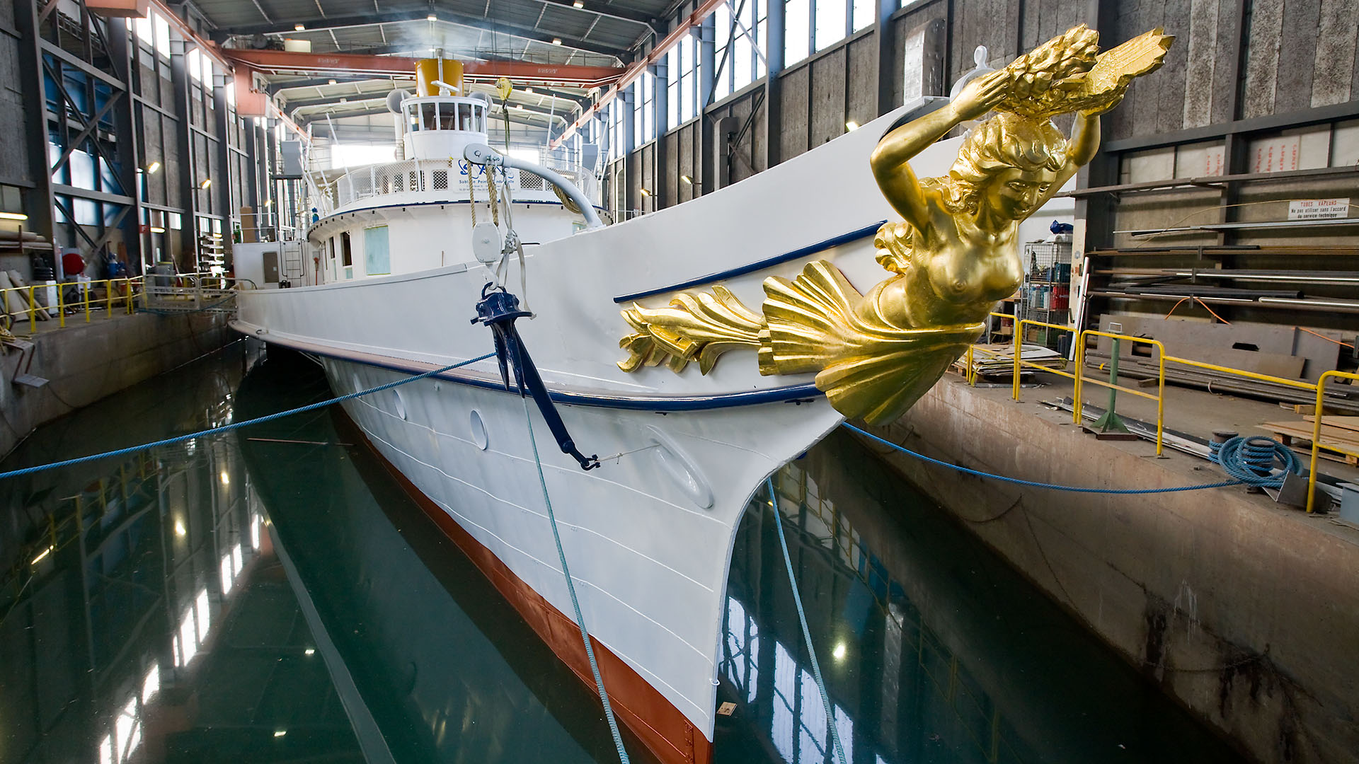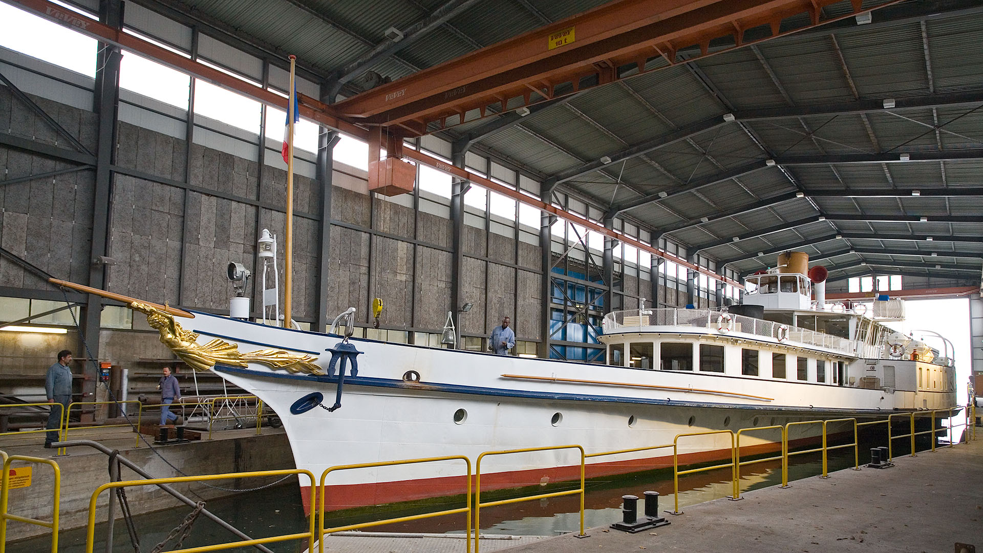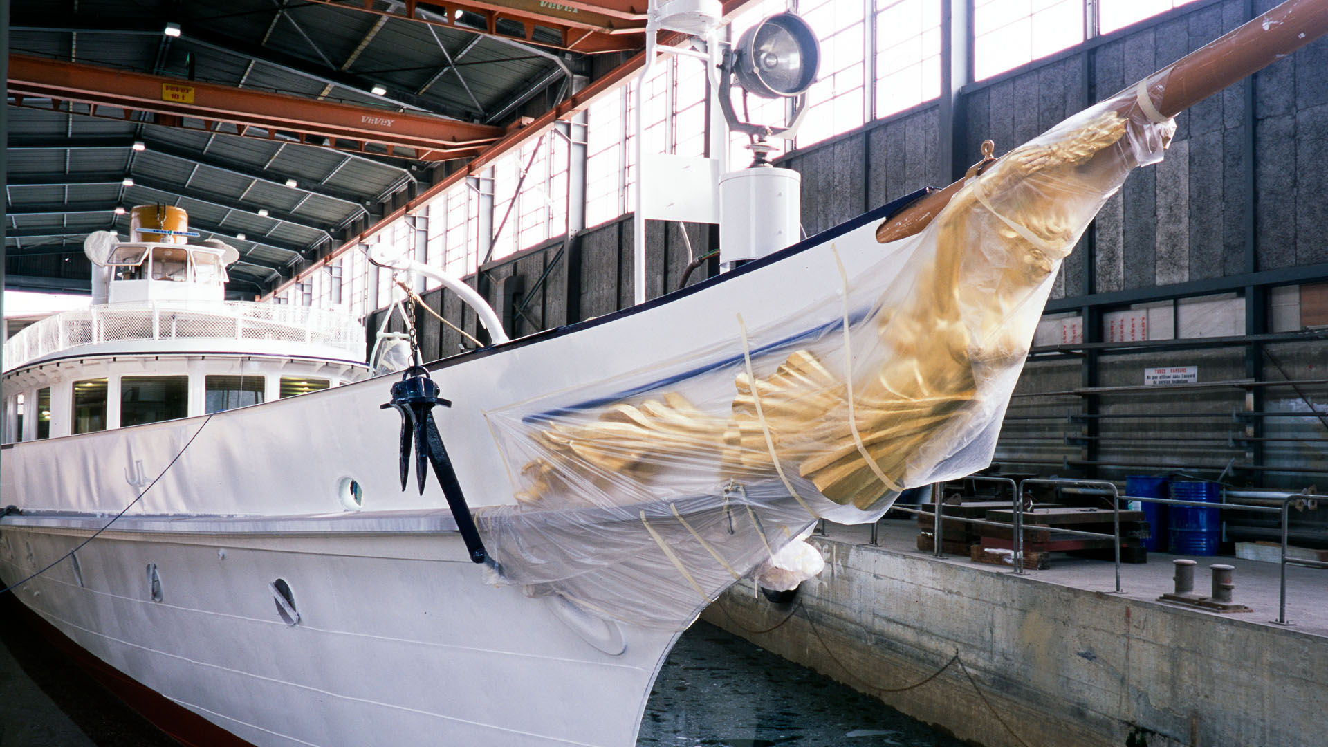 Mise en place des décorations de proue & de poupe, réparation après collision, au chantier CGN (2003)