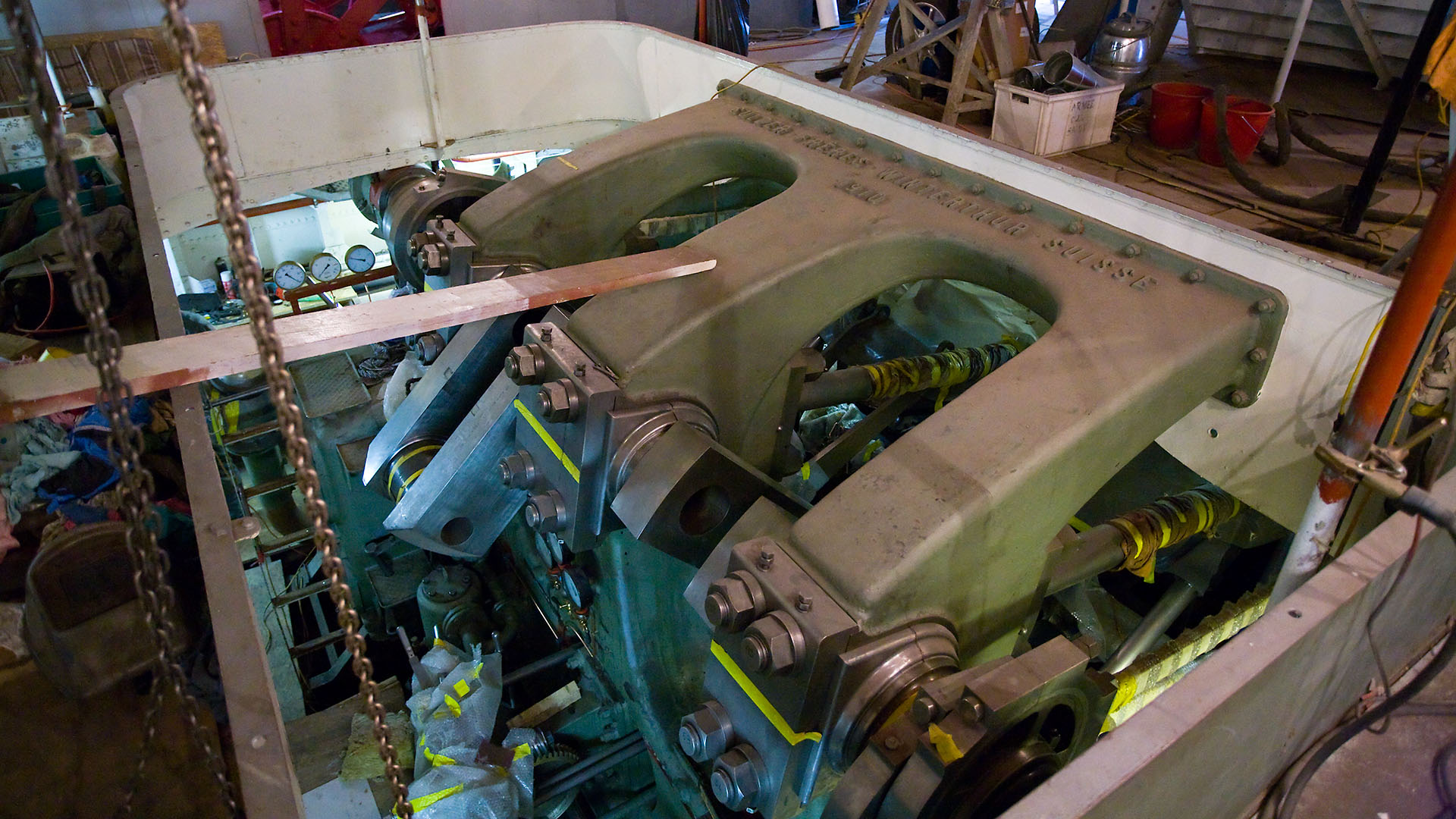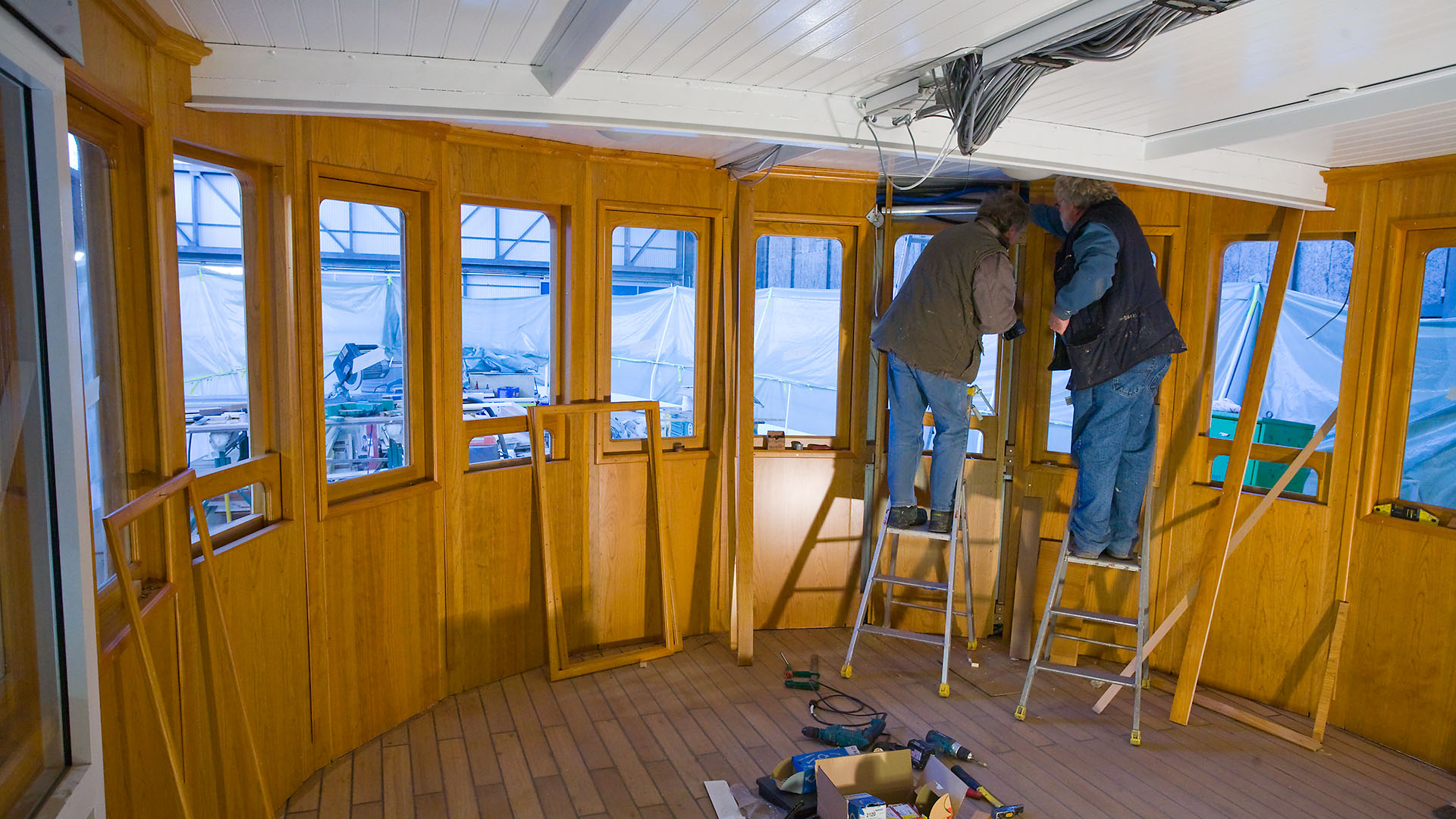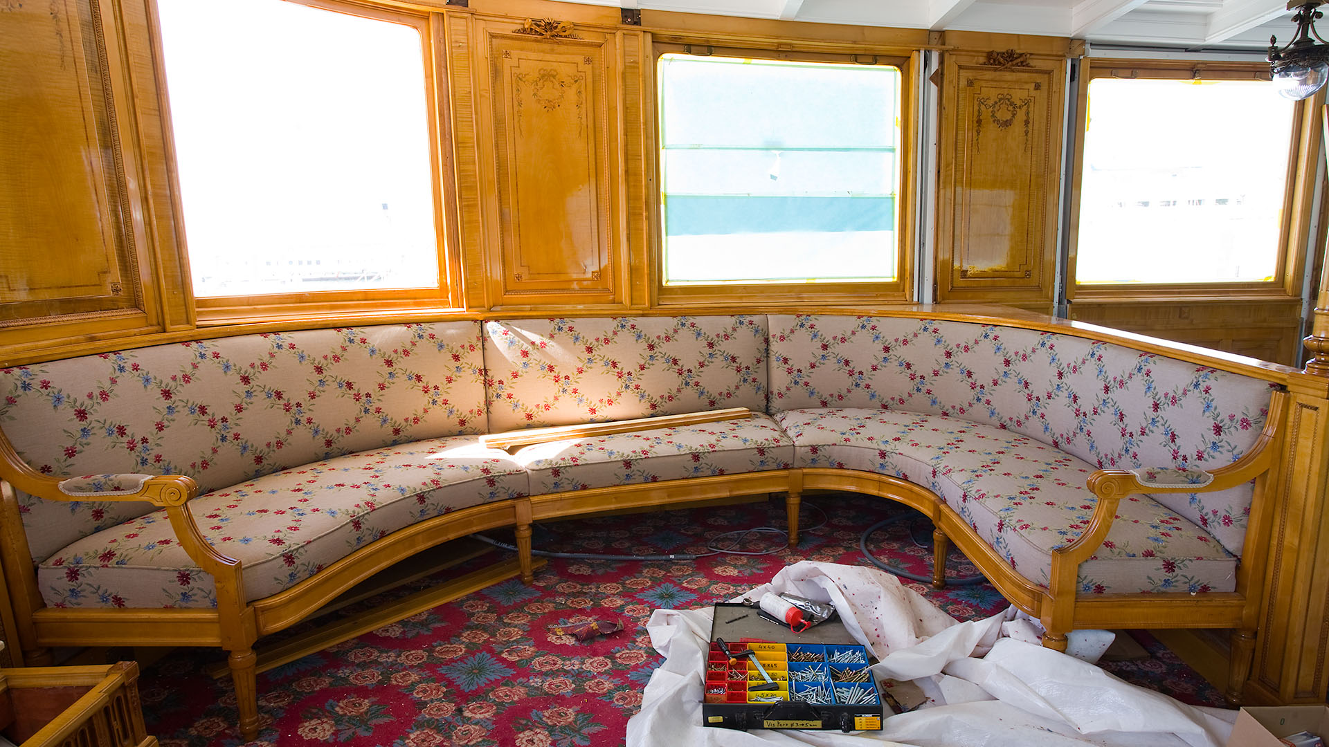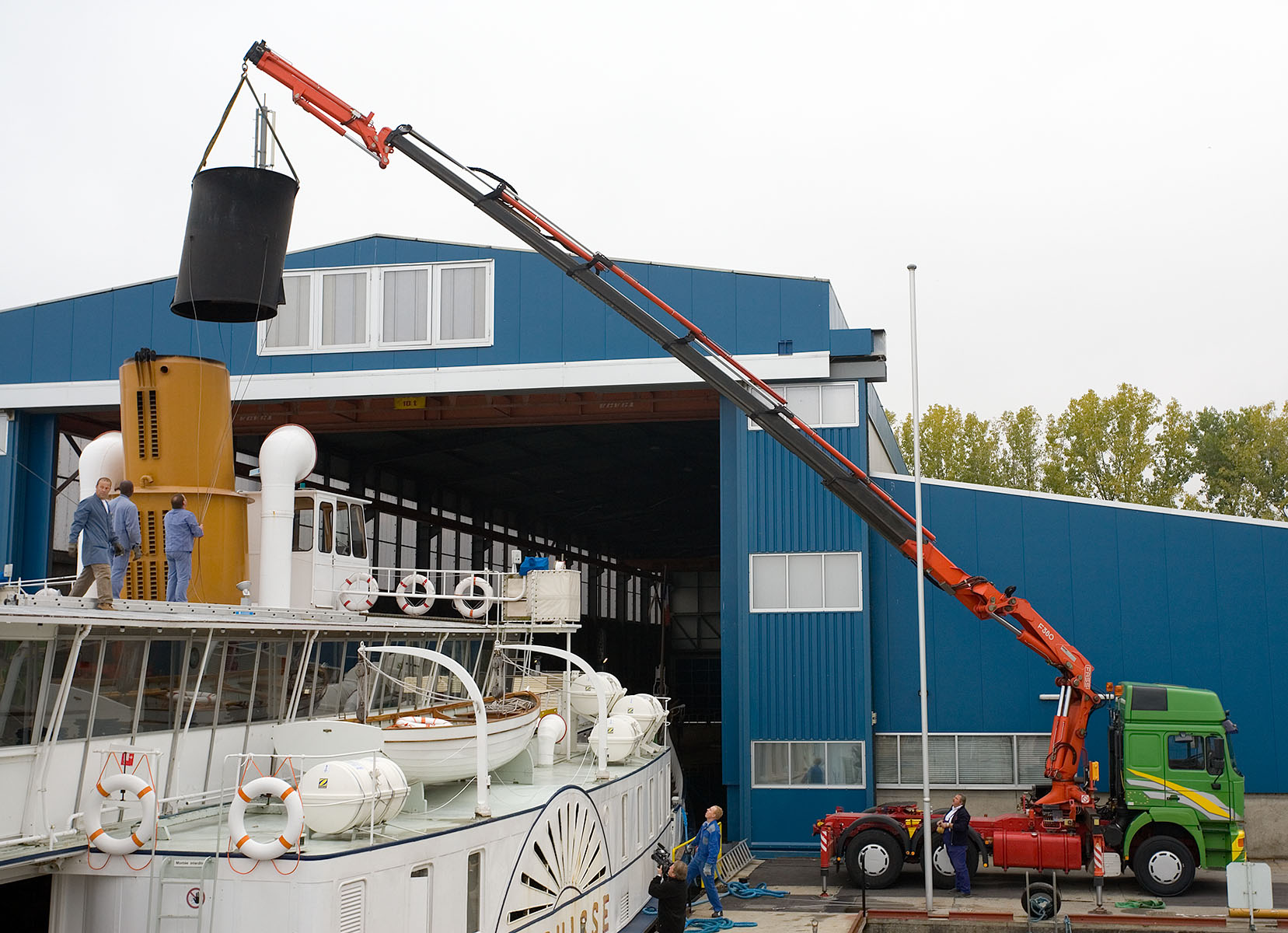 Mise en place des décorations de proue & de poupe, réparation après collision, au chantier CGN (2003)