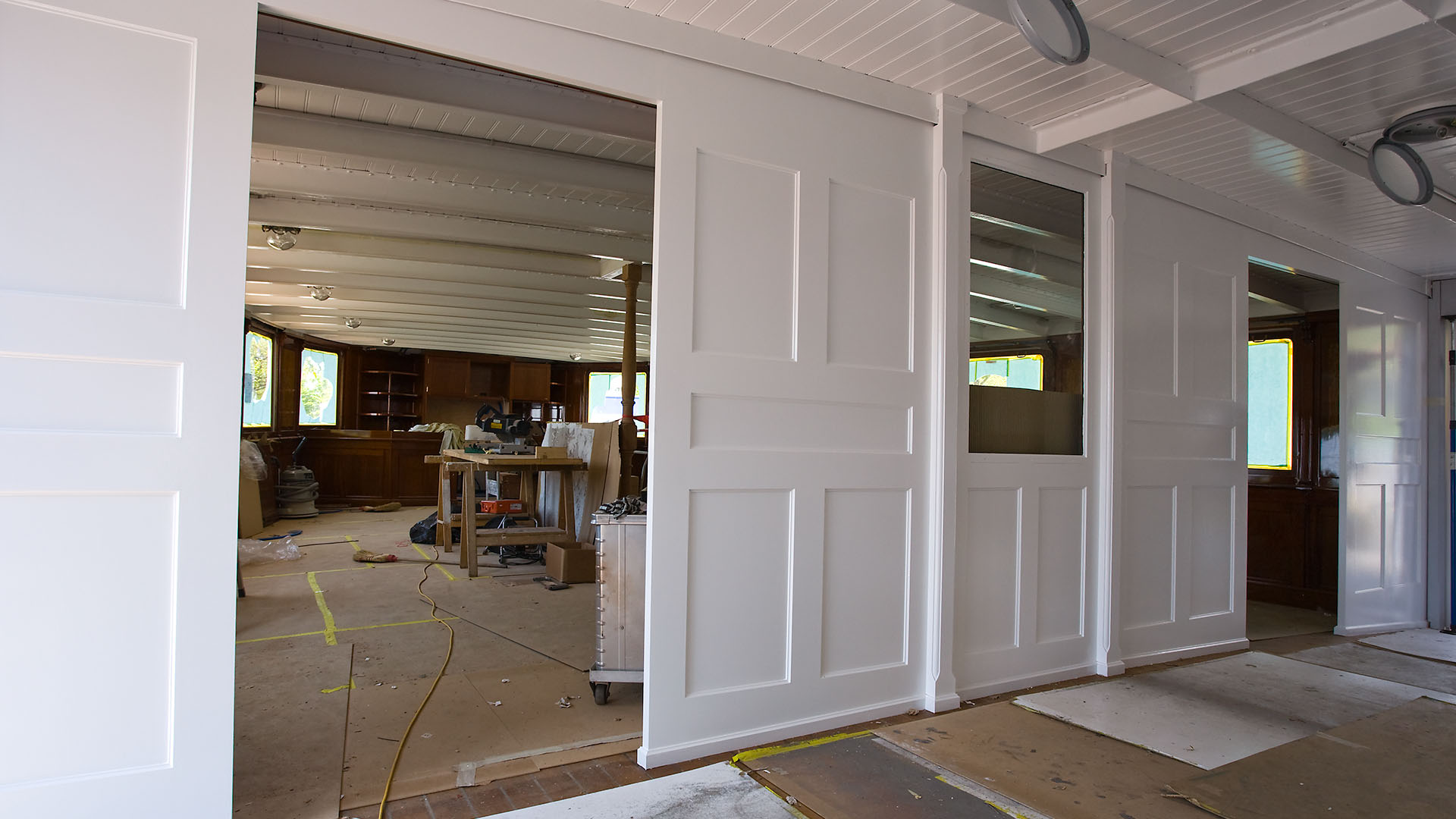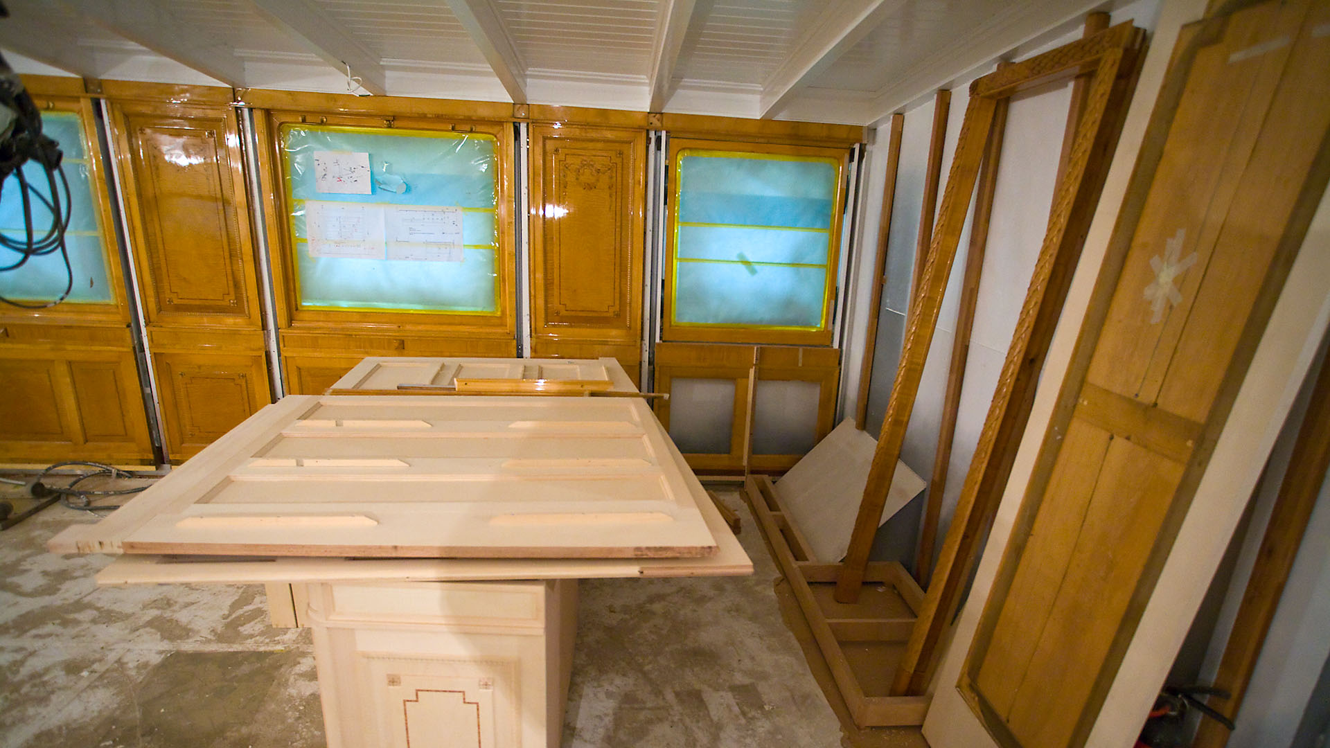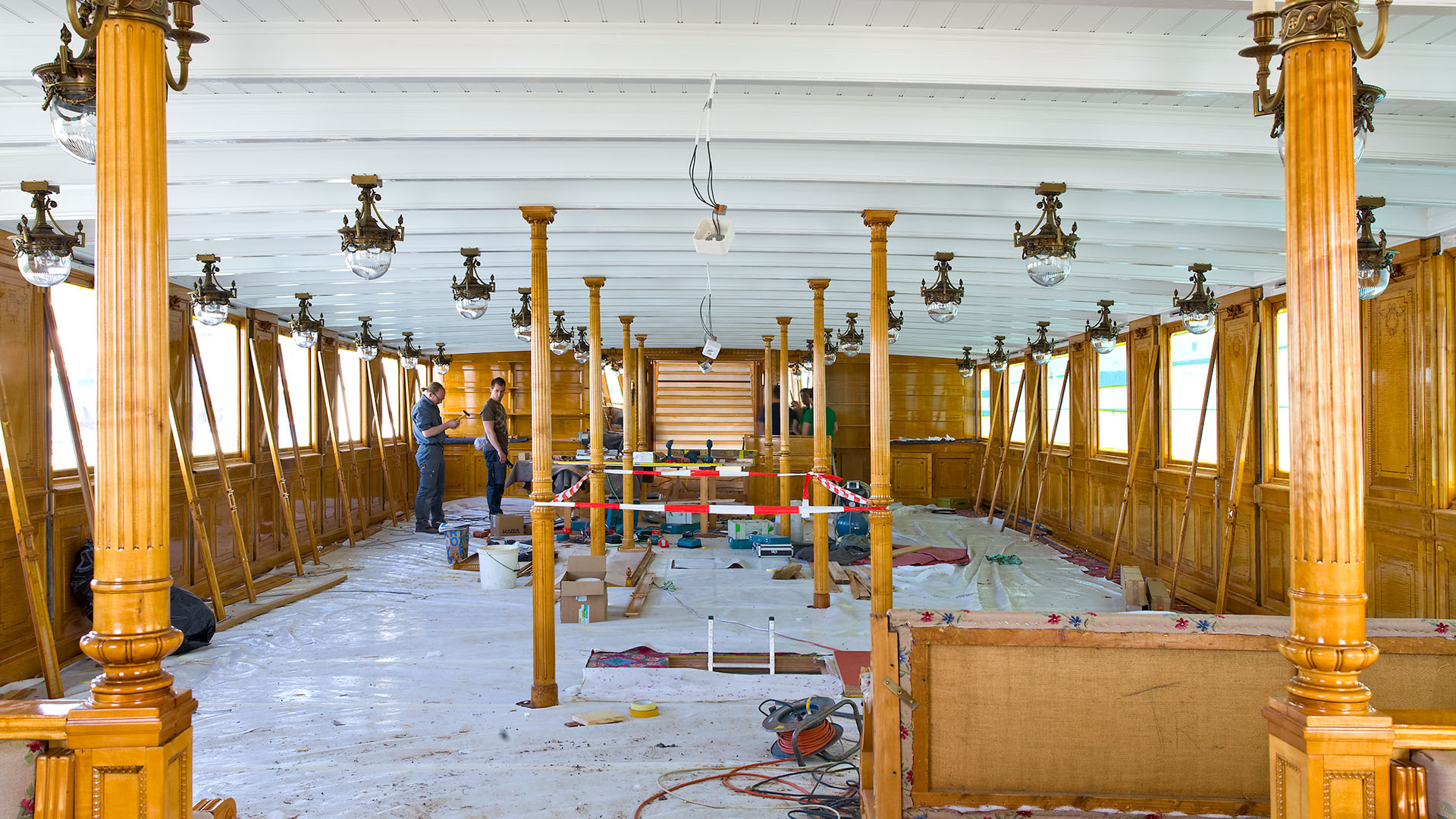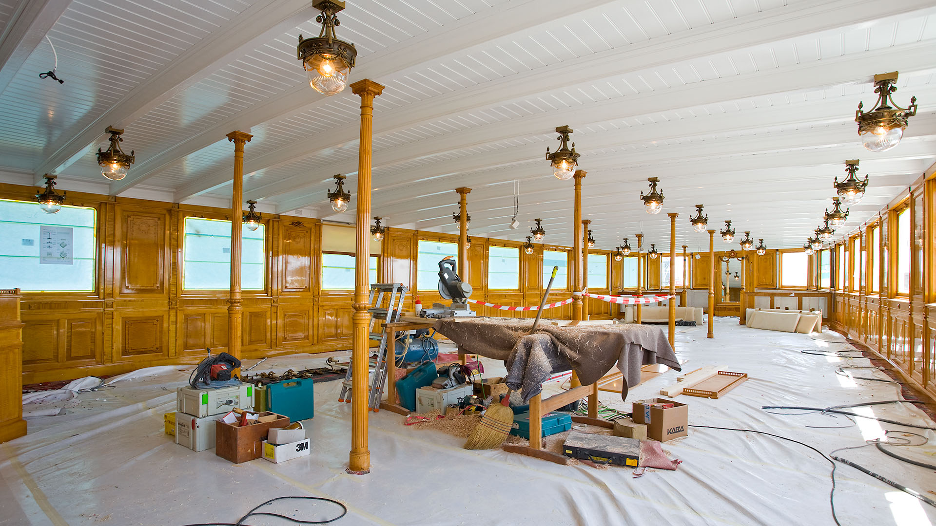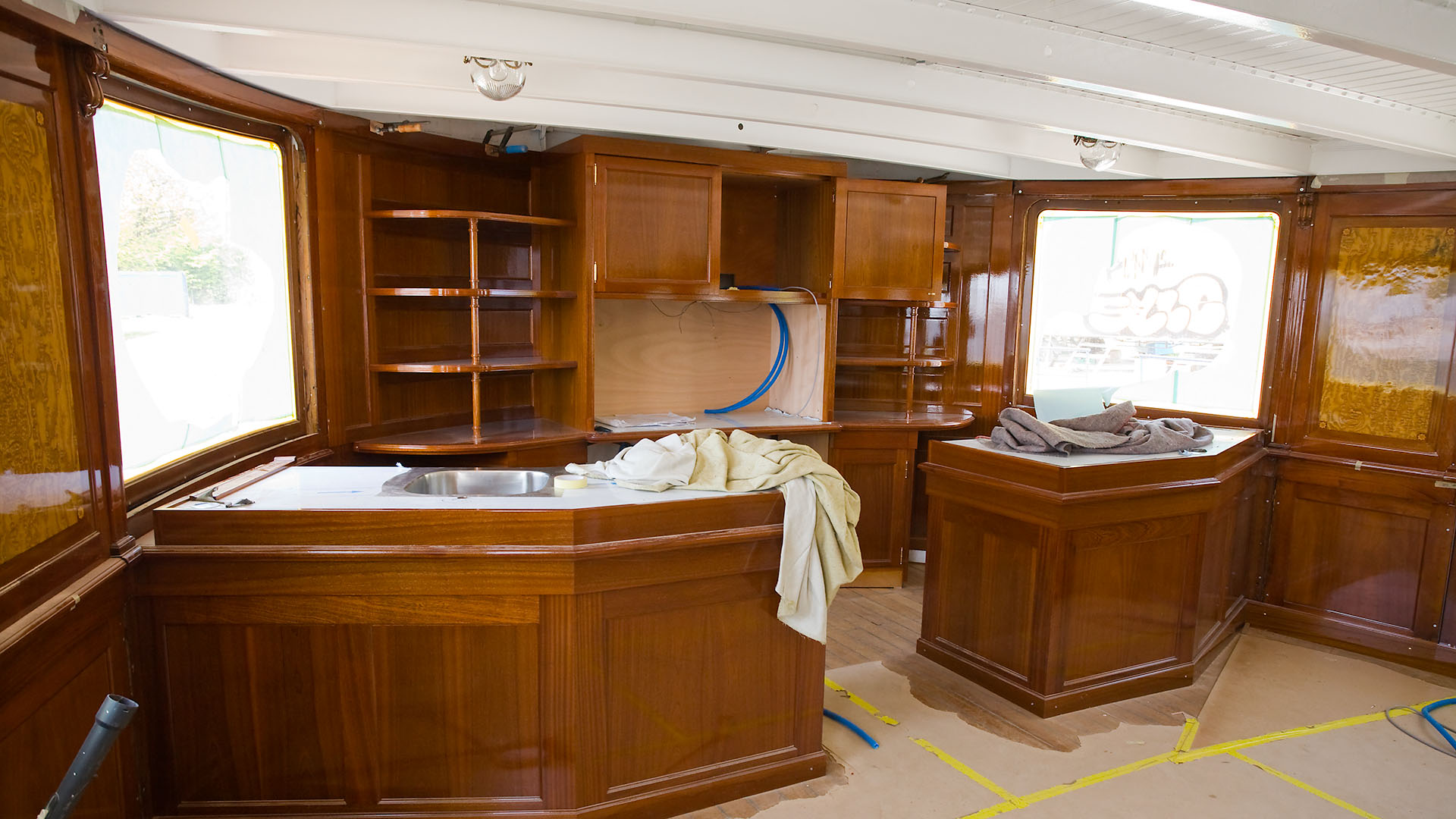 Mise en place des décorations de proue & de poupe, réparation après collision, au chantier CGN (2003)