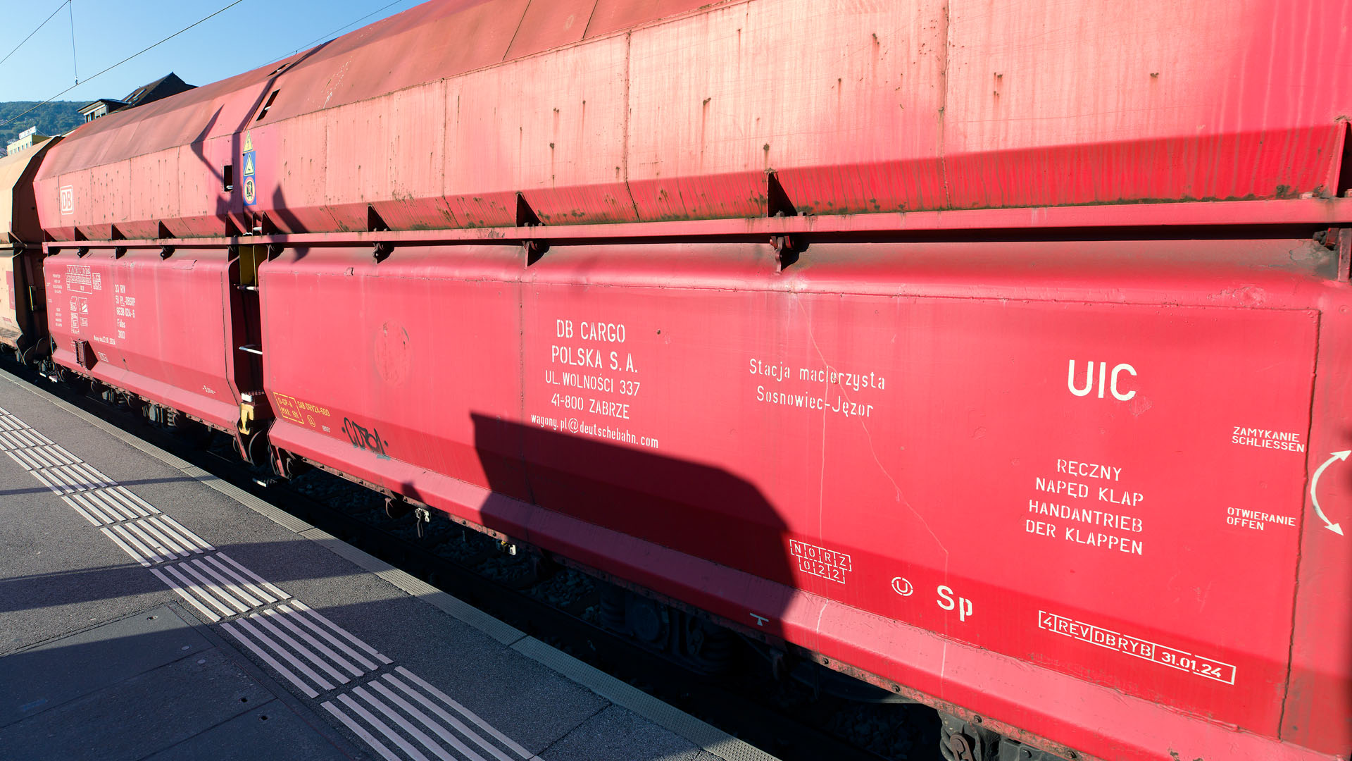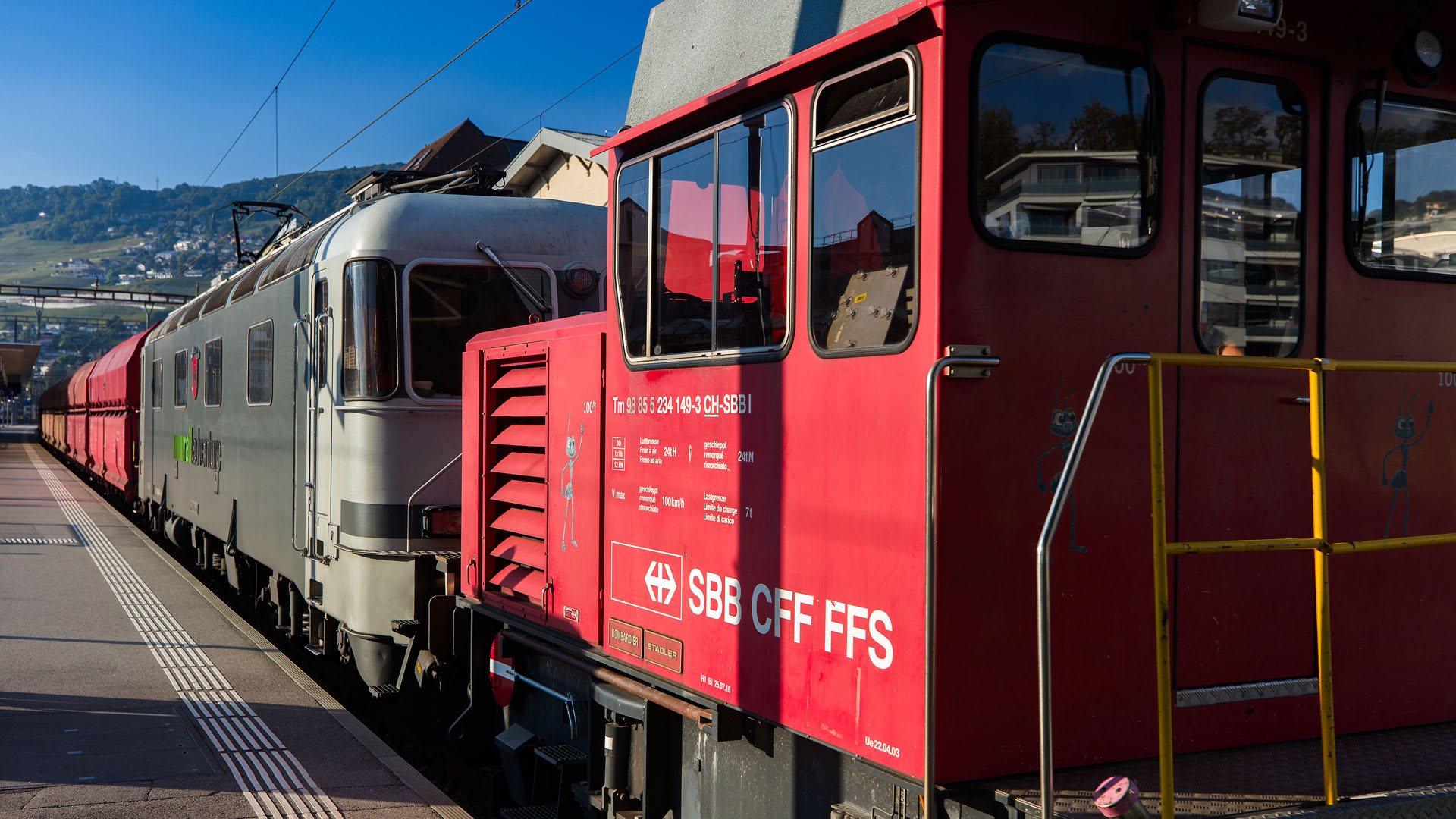 Transfert de wagons-trémies DB/PKP à Villeneuve, tracté par Tm 234 + Re 6/6 RADV (Vevey, 1er octobre 2025)