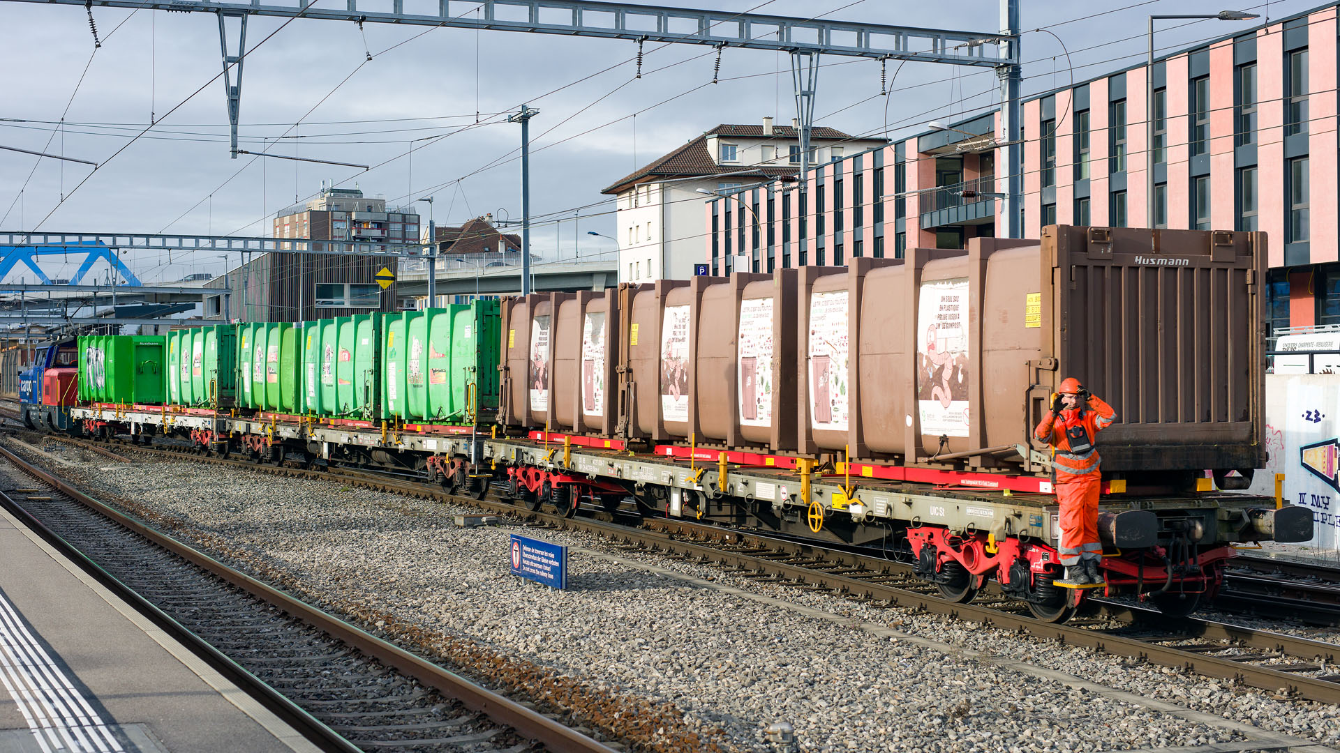 Eem 923 refoulant une rame de wagons chargés de conteneurs TRIDEL (Renens, 28 novembre 2025)