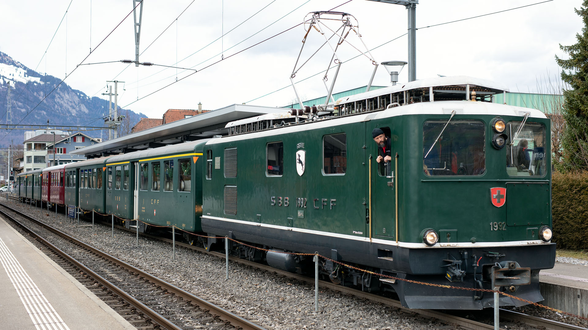 Train spécial pour la St-Nicolas Lucerne-Brünig, rame historique tractée par la HGe 4/4 1992 (Sarnen, 6 décembre 2025)