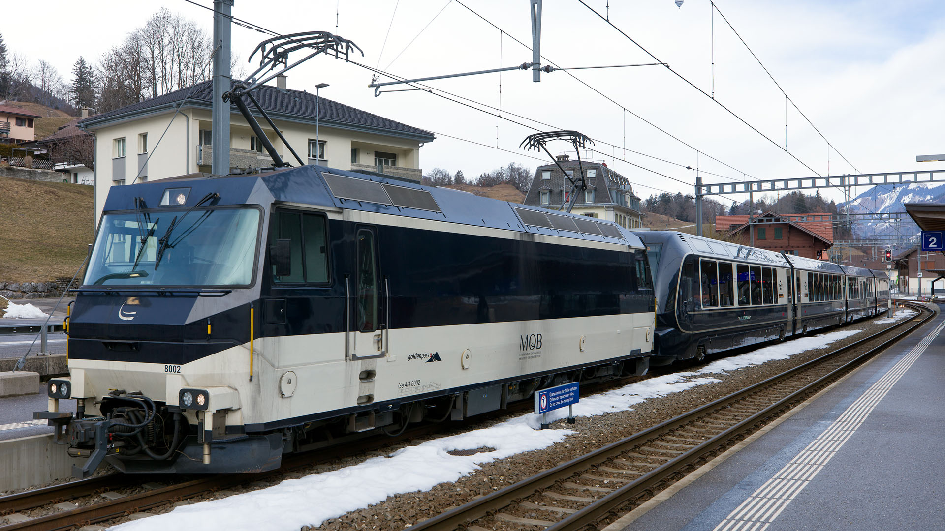 Ge 4/4 8002 + rame MOB GPX (Montbovon, 24 janvier 2026)