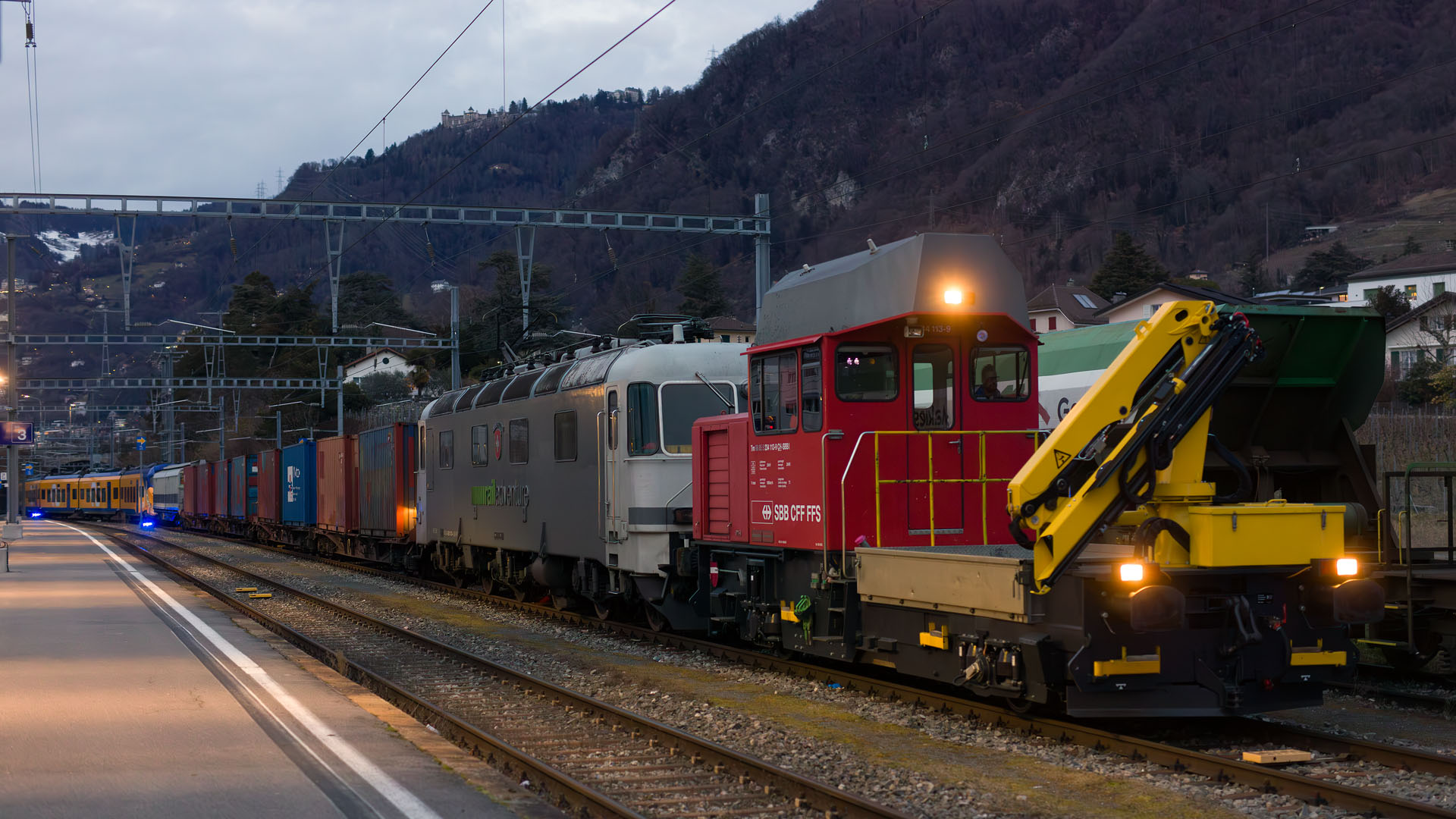 Arrivée d'une rame NS destinée à l'usine Alstom et remorquée par Tm 234 (pour ETCS 2) et Re 6/6 RailAdventure (Villeneuve, 2 février 2026)